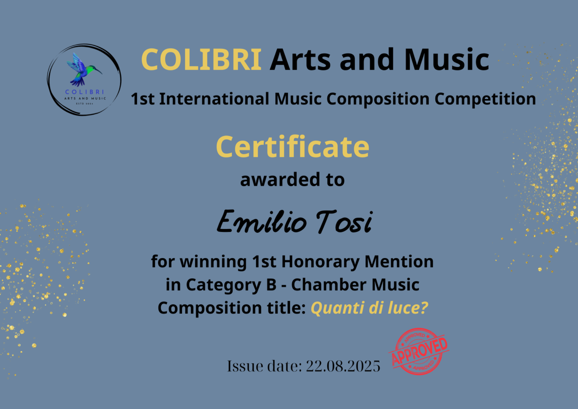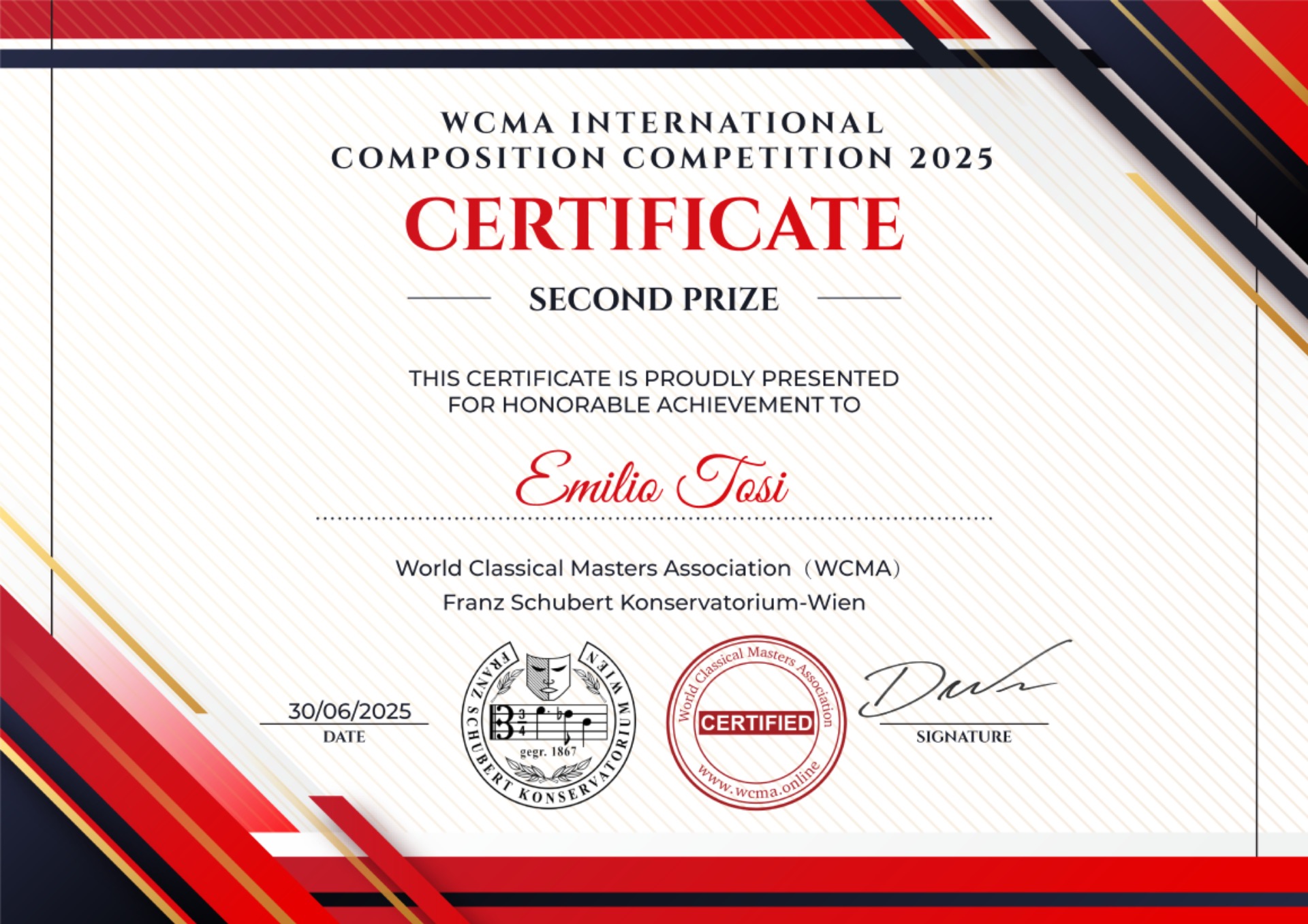 Nonostante non sia stato selezionato come vincitore, sappi che la tua candidatura si è distinta e sei tra i musicisti particolarmente apprezzati dalla giuria. Di conseguenza, sei stato inserito nella rosa dei finalisti. Ti invitiamo a considerare questo come un riconoscimento delle tue capacità e un invito a continuare a perseguire le tue aspirazioni musicali. Ci auguriamo sinceramente di vederti tra i candidati per i nostri futuri concorsi.